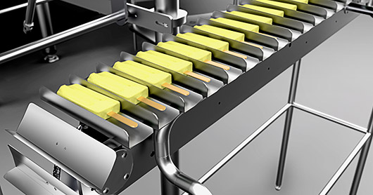 A saída do equipamento será sincronizada com uma embaladora de picolés automática, também monitorada pelo computador central da máquina. Todas as operações e possíveis falhas serão totalmente acompanhadas eletronicamente, evitando travamentos e desperdícios de matérias primas durante o processo, além de oferecer segurança total ao operador.